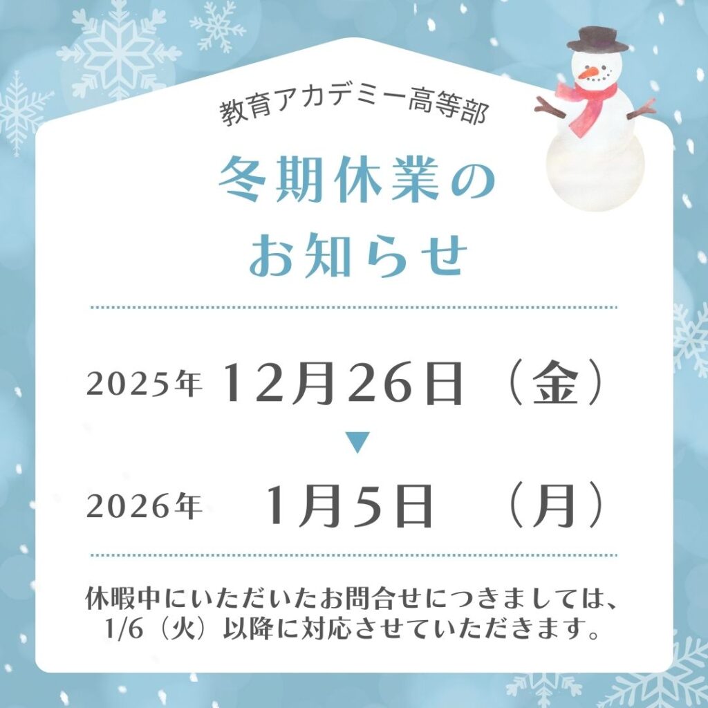 教育アカデミー高等部 港北事務センターは、下記の期間、年末年始のため 冬期休業 とさせていただきます。