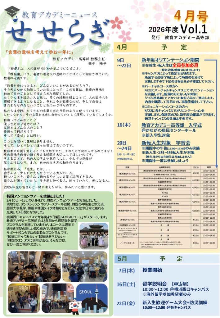 教室だより「せせらぎ4月号」